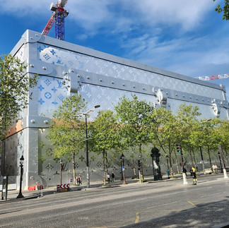 And there it was: Louis Vuitton’s new flagship, standing across from its former home like it owned the block (which, let’s be honest, it probably does). The building itself? A full-blown statement. It resembled one of their iconic travel chests—complete with silver-toned clasps, corner buckles, and enough swagger to intimidate every credit card within a three-block radius. Bigger. Shinier. More architecturally intimidating. If old money and new money had a baby, this building would be its college graduation gift.